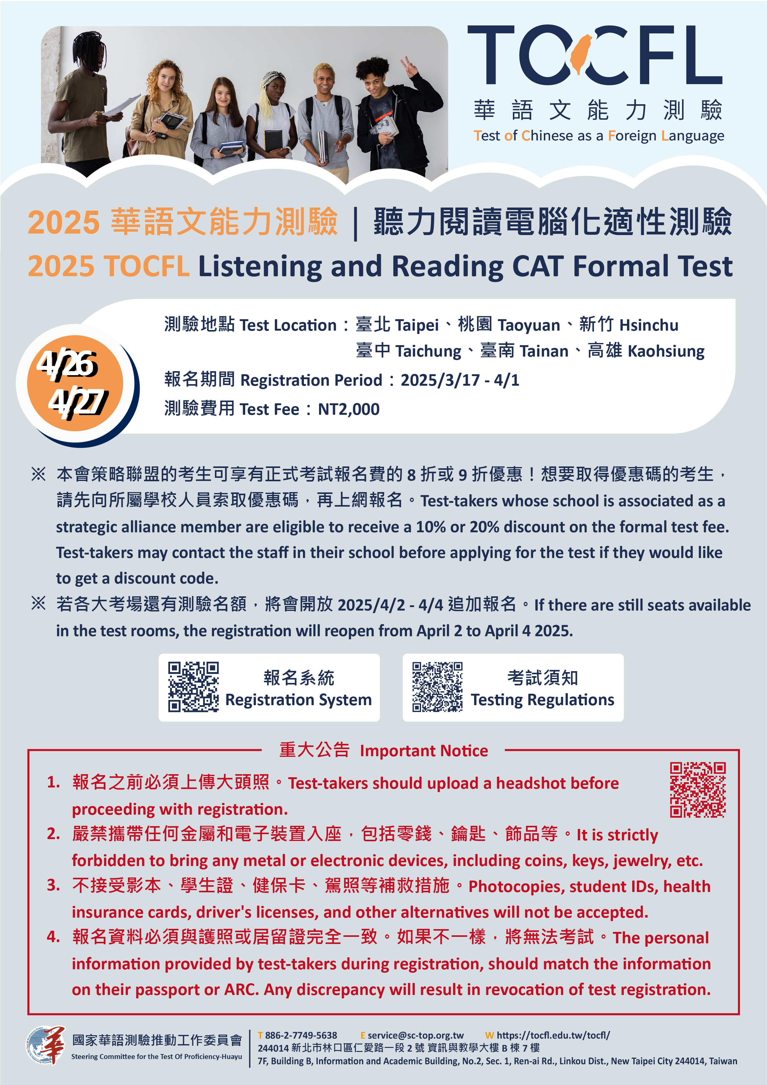 二、測驗日期:4月26至4月27日(星期六、星期日)聽讀測驗-電腦化適性測驗。