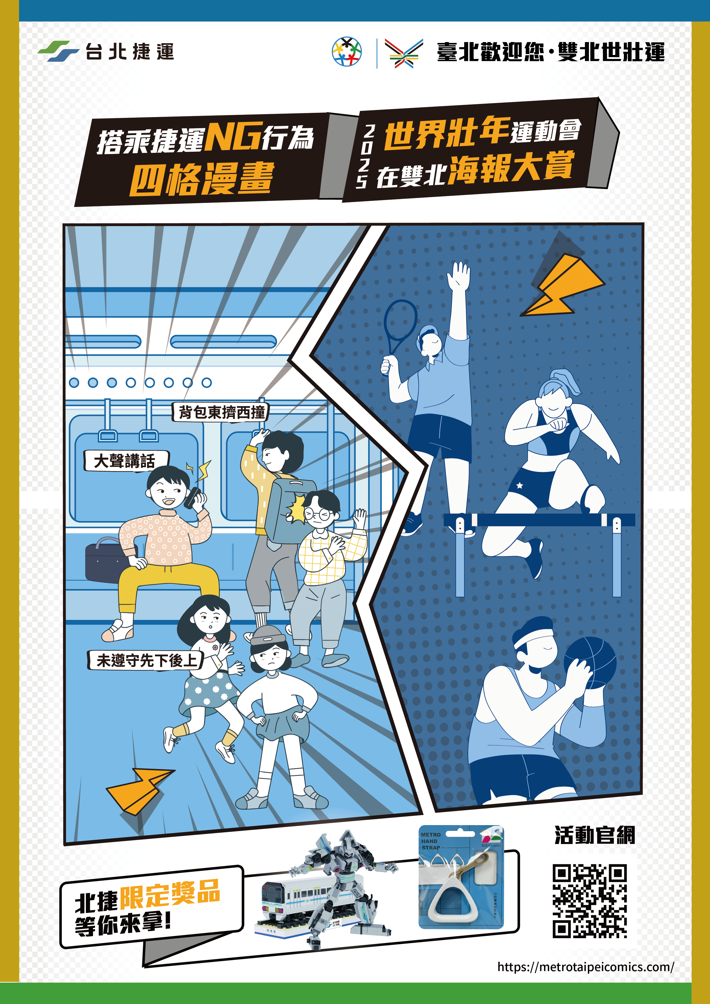 二、臺北大眾捷運股份有限公司辦理漫畫徵稿活動,期能透過孩童視角呈現捷運上的NG行為,讓孩童在參與中學習並培養良好乘車禮儀;另為慶祝雙北市主辦 2025年世界壯年運動會,同時推出宣傳海報徵選活動,歡迎全民發揮創意, 共襄盛舉。