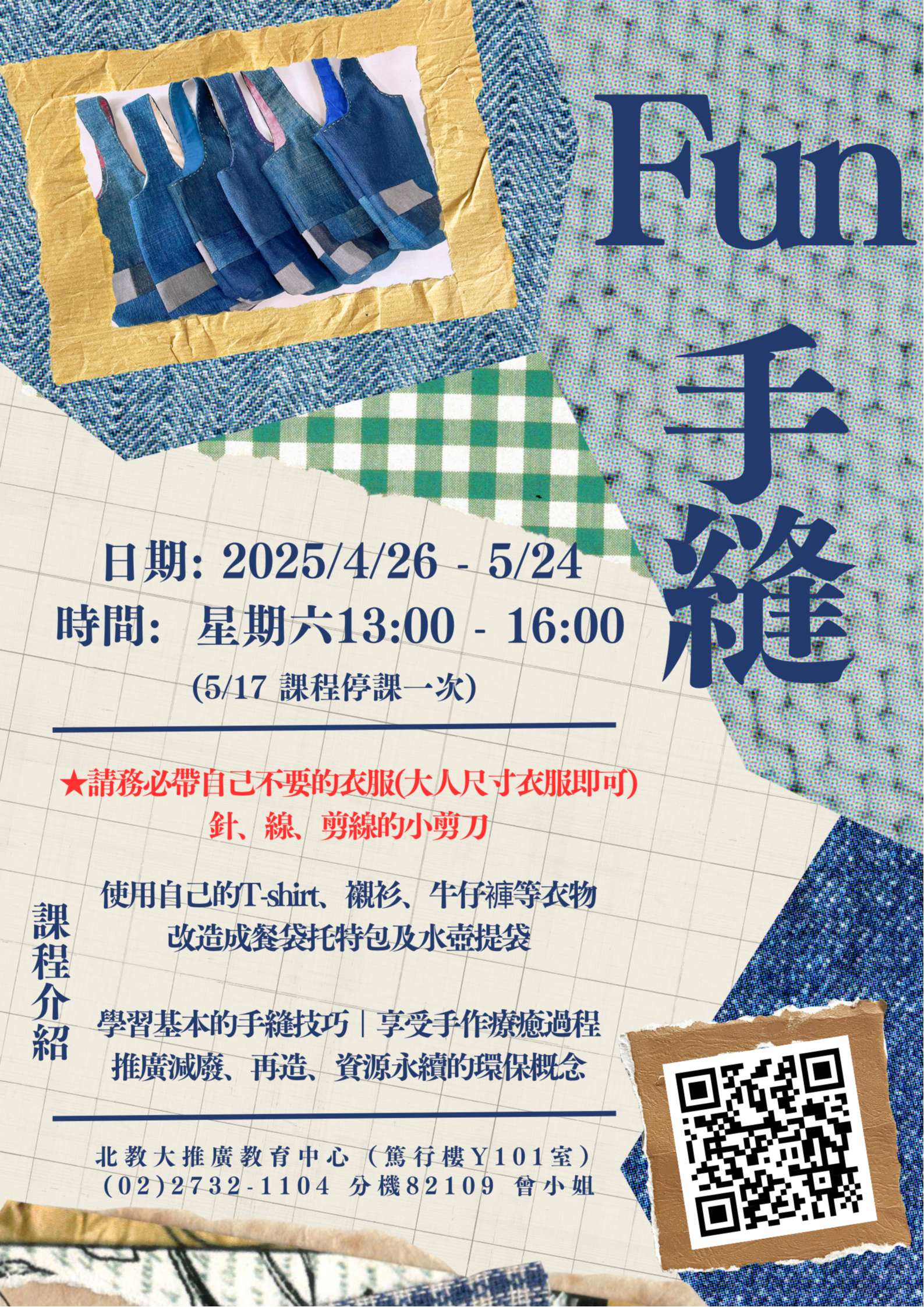 一、國立臺北教育大學推廣教育中心辦理為期四週的生活藝術系列課程,即日起開放報名,課程資訊如下:生活藝術系列—Fun手縫 (HandMay五月場)