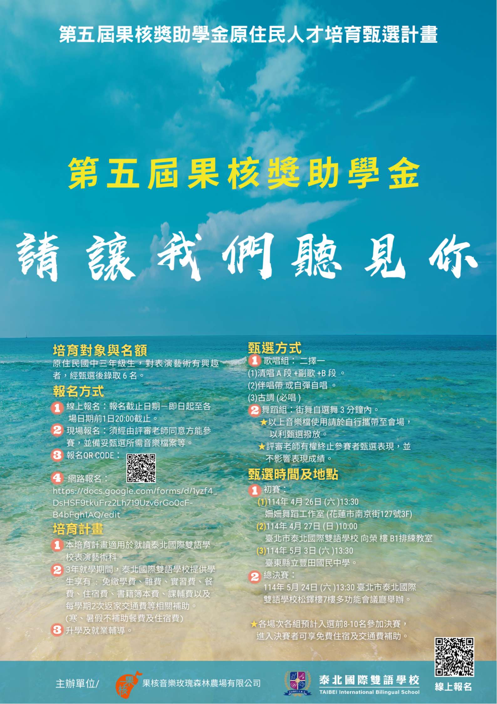 一、為鼓勵具藝術潛能之原住民學生多元發展,並提供完善教育資源,本校與果核音樂玫瑰森林農場有限公司合作辦理 「果核獎助學金原住民人才培育甄選計畫」,歡迎對表演藝術有興趣之原住民學生報名參加。