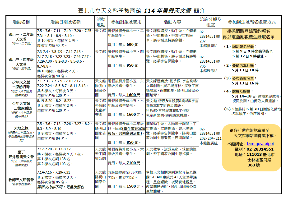 ※各活動詳細簡章請至天文館網站瀏覽或下載。網址: tam.gov.taipei
