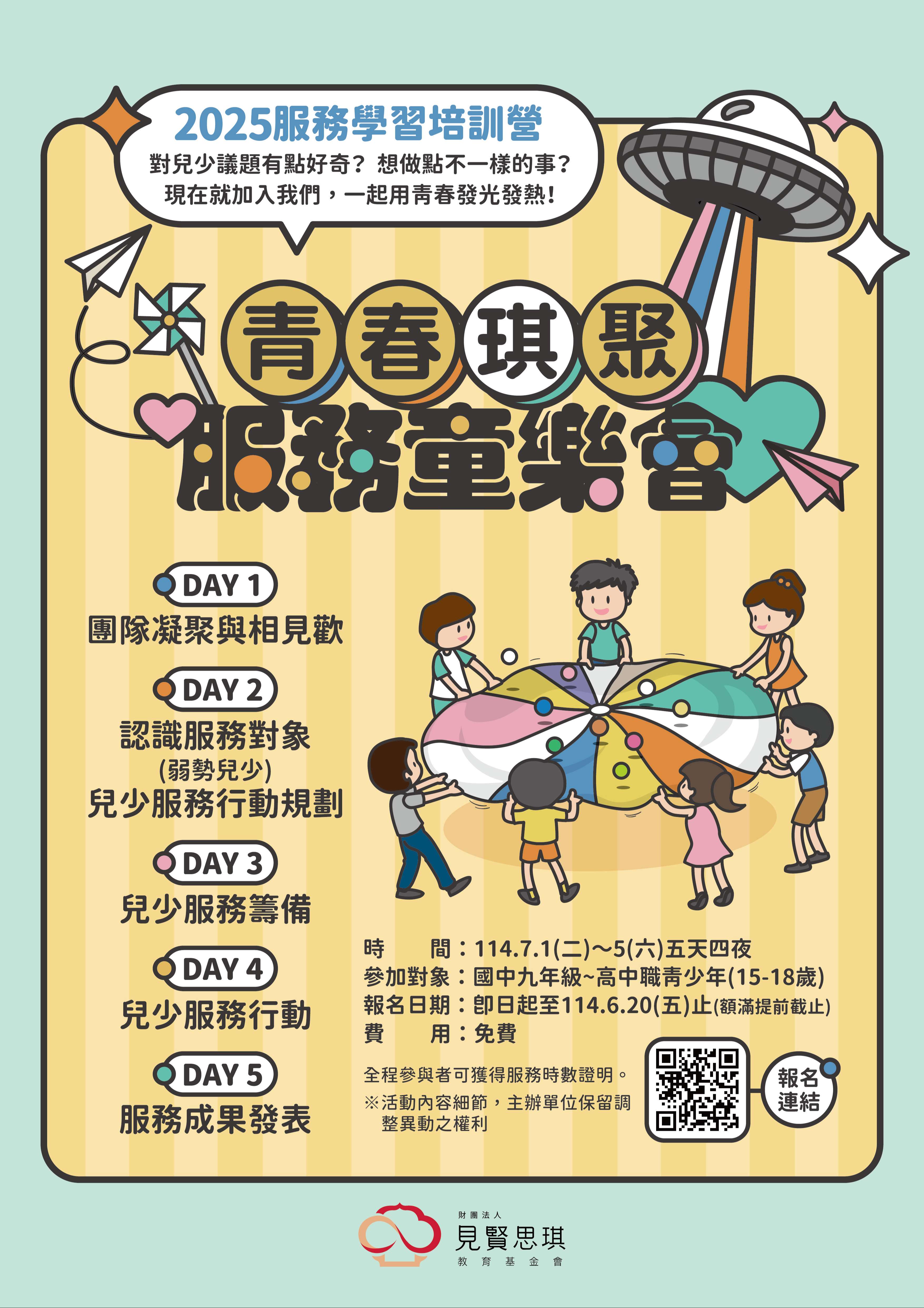 一、為提供青少年社會參與機會,並增進其對兒少議題的關注與認識,財團法人見賢思琪教育基金會規劃辦理「2025青春琪聚-服務童樂會」暑假服務學習培訓營;內容涵蓋團體凝聚、認識弱勢兒少、服務行動規劃與執行、服務反思及成果發表等活動,透過做中學的模式,培養青少年品德素養能力,歡迎有服務熱忱的青少年踴躍參與。