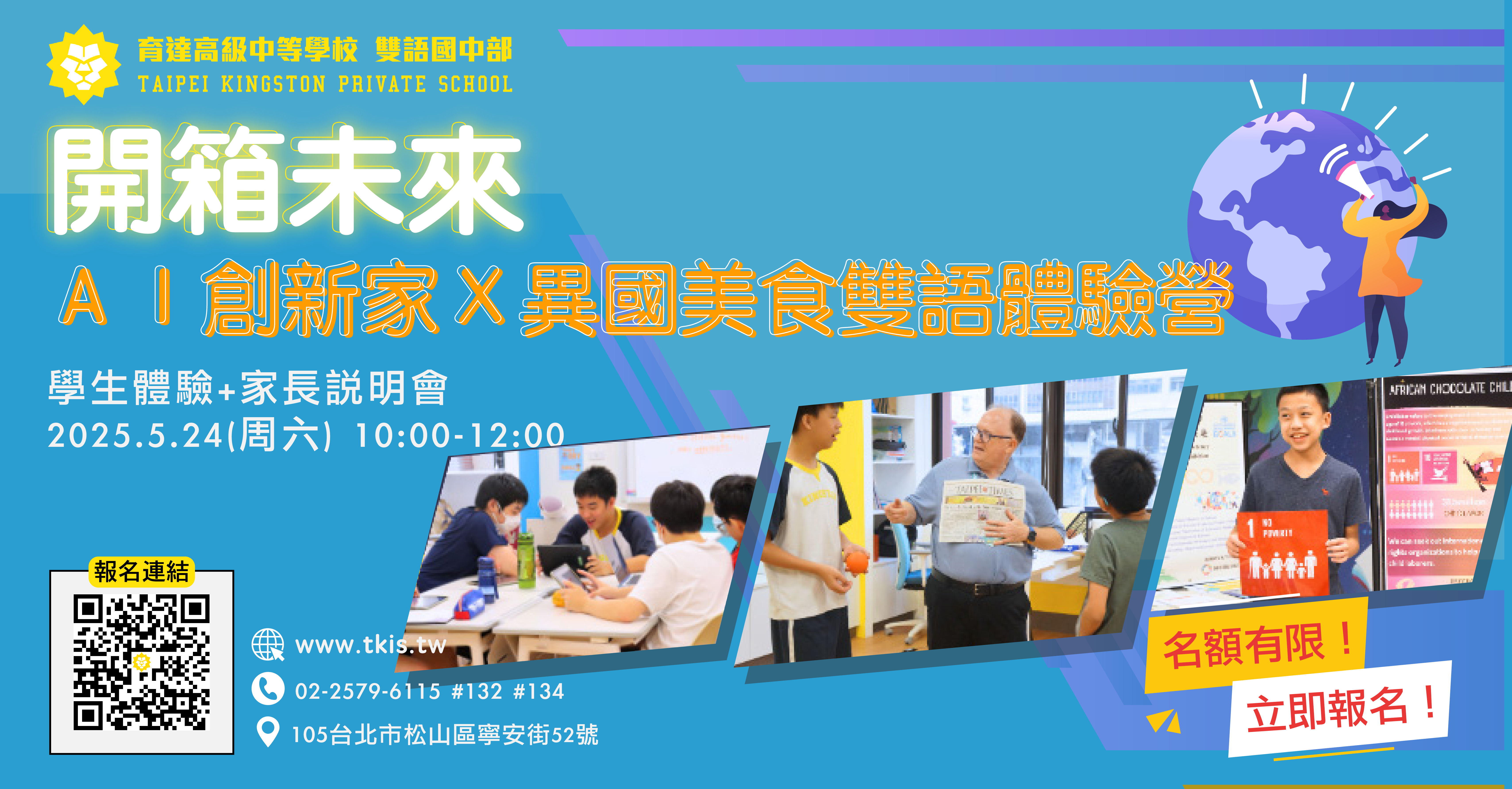 一、課程介紹:在全球化的時代,雙語能力是孩子未來發展的重要資產,本次Kingston雙語體驗營集結學校外師與中師,設計一系列豐富有趣的體驗課程,讓學生能在半日的課程中學習如何以地球永續的概念,結合AI科技趨勢,設計未來產品,外師分享異國美食文化,打開國際觀!也在同一時間安排入學說明會,深入介紹課程規劃與環境導覽,歡迎爸爸媽媽帶著孩子一同報名參加!
