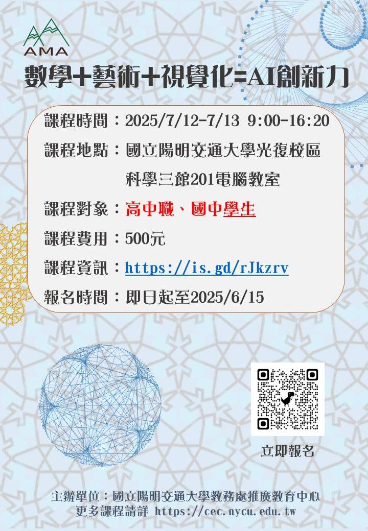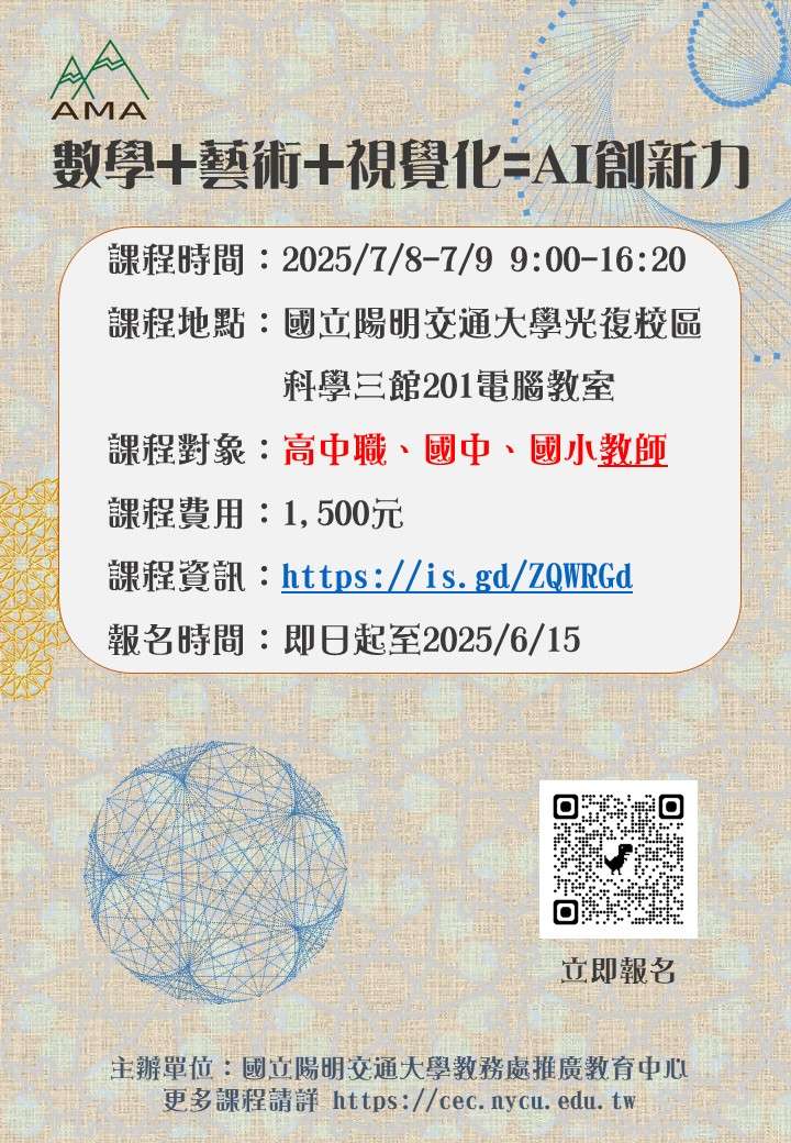 一、旨揭課程融合數學 × 藝術的視覺化創作精神,結合STEAM 教育理念,透過專為圖形結構與視覺資訊設計而生的 AMA 平台,帶領學員深入探索幾何變換與集合運算在對稱、鑲嵌、疊代與規則圖案生成中的應用,並引導將這些抽象概念轉化為具體的圖像藝術與創意表徵,激發數理思維與藝術表達的雙重潛能。讓數學成為啟發創造力與洞察力的橋樑,開啟智慧(Activating Intelligence)的新視界。