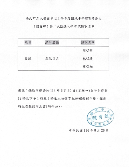 公告本校114學年度國民中學體育績優生(體育班)第二次甄選入學錄取名單