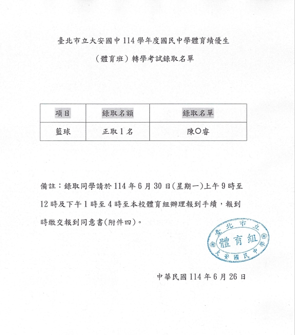 公告本校114學年度國民中學體育績優生 (體育班)轉學考試錄取名單