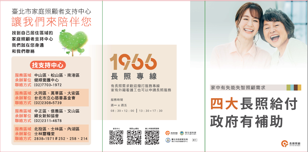 您有居住在臺北市的親友或長輩申請長照服務,可撥打1966 長照服務專線,提供便利的長照單一窗口! 5 分鐘內通話免付費 !一通電話留下資訊, 讓長照服務就近到您家。