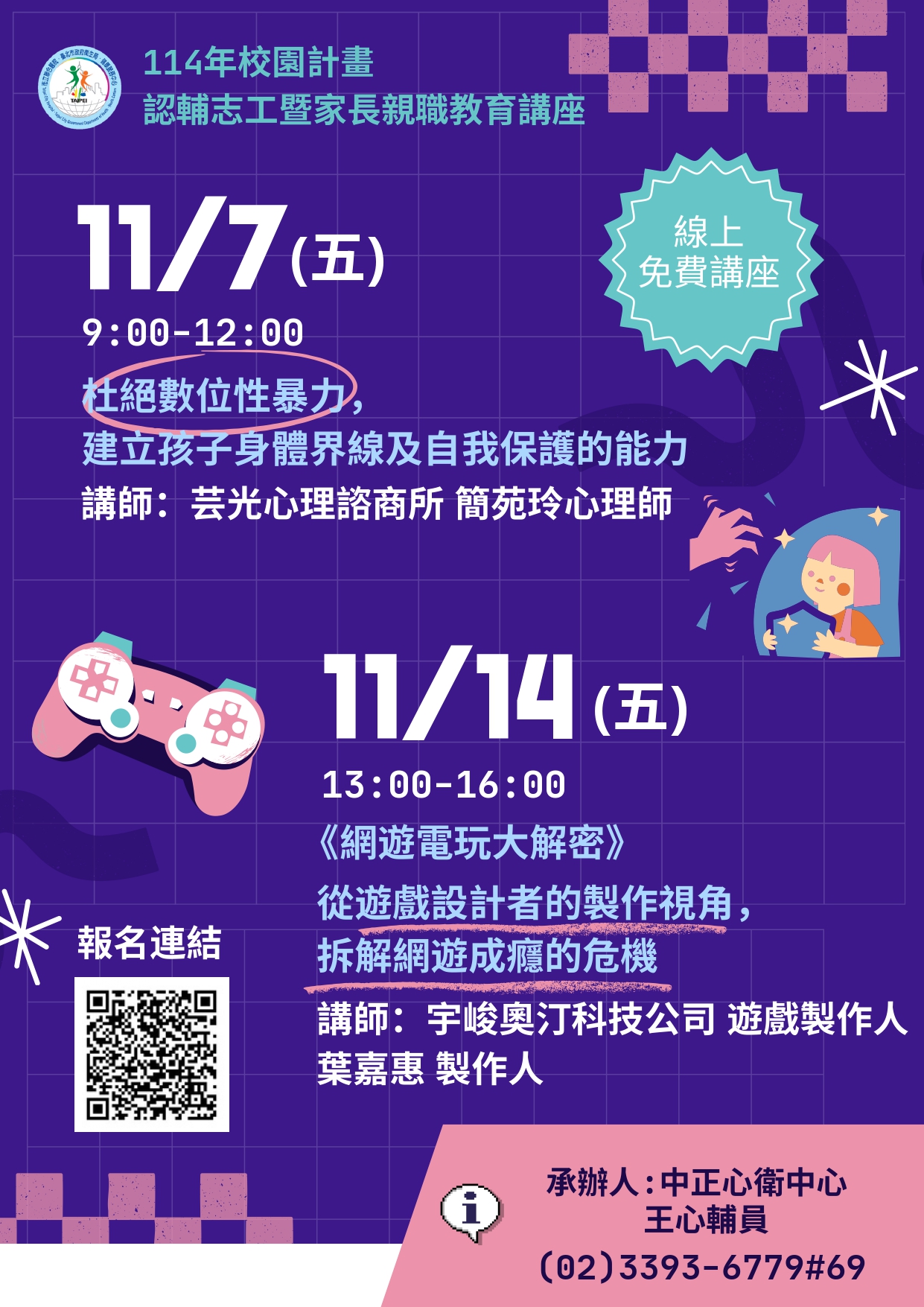 臺北市政府衛生局辦理114年度校園認輔志工暨親職教育線上講座-兒少心理健康促進課程,歡迎有興趣者自行報名參加!