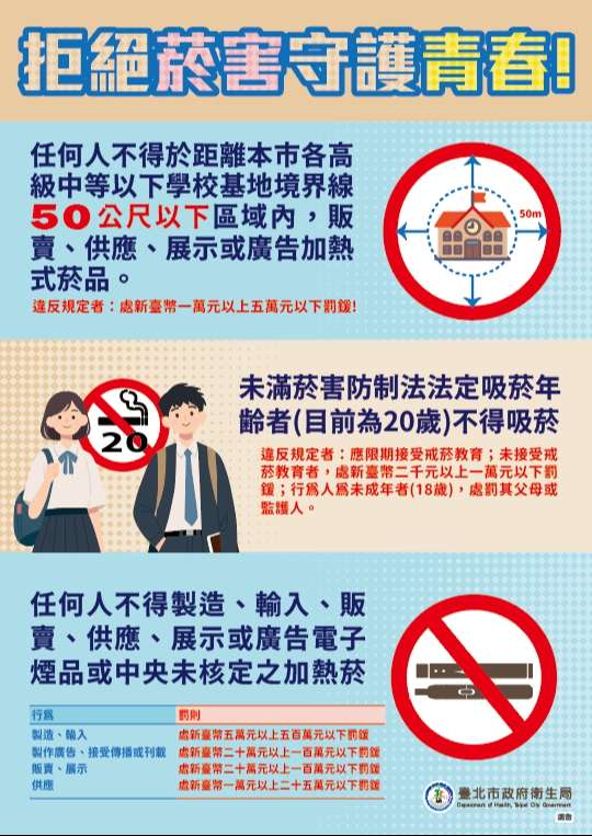 二、鑑於2家加熱菸業者產品即將合法上市,為避免青少年誤認 其無害或產生好奇而接觸,本局特製作宣導海報,提升本 市高中職以下學校學生菸害防制知能及瞭解菸害防制法相 關罰則。