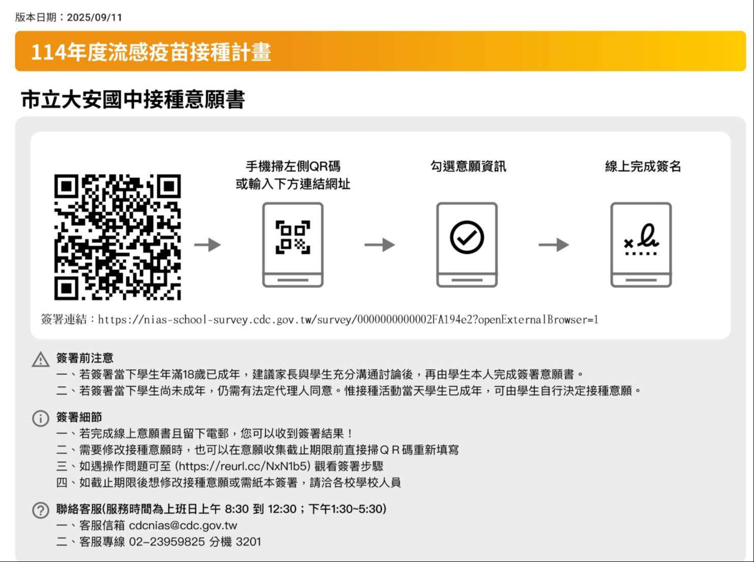 5、請於 10/06(星期一) 前完成“校園流感疫苗電子化系統線上簽署意願。
