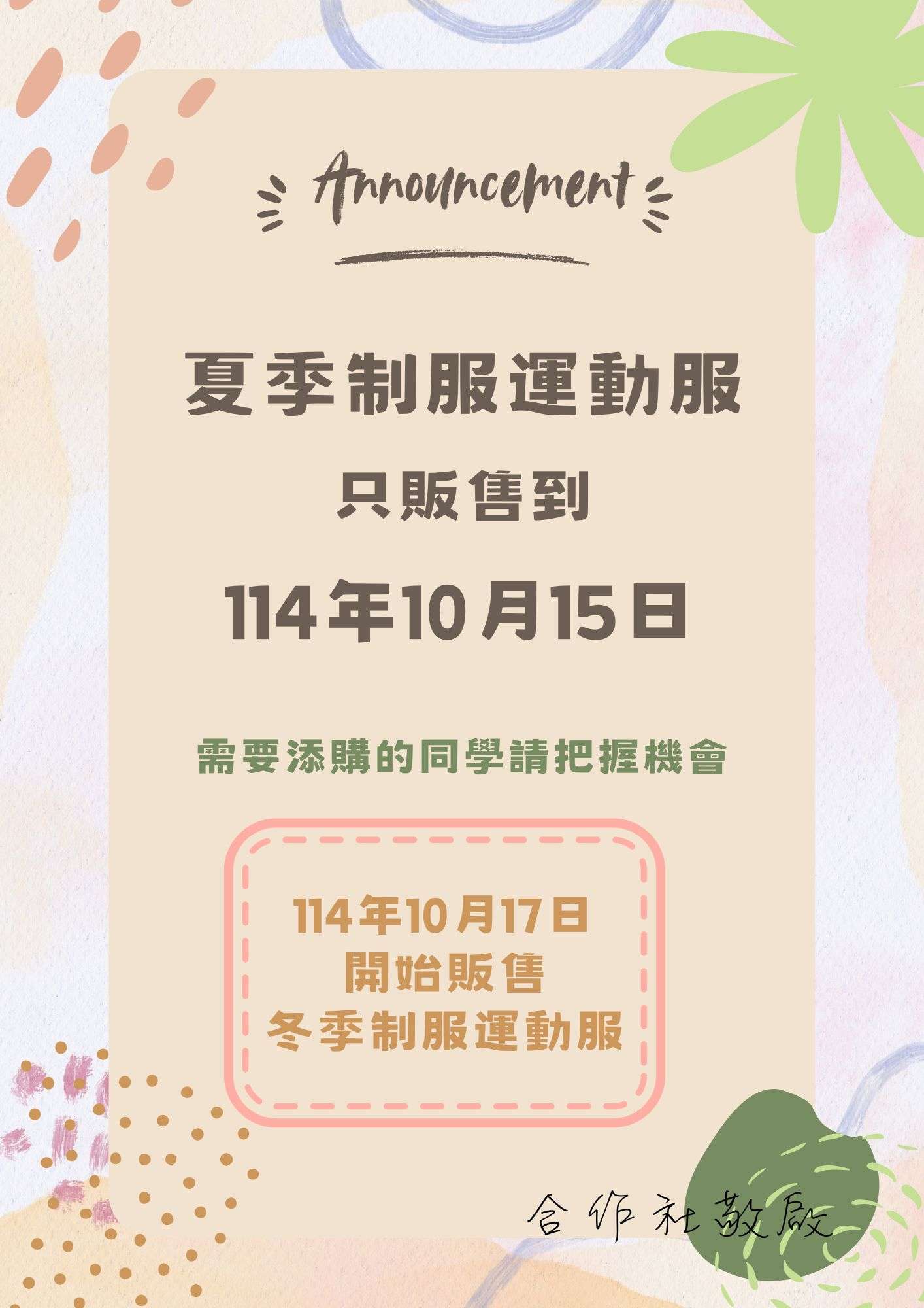 冬季制服則預計於 114 年 10 月 17 日(星期五) 起在合作社上架販售。