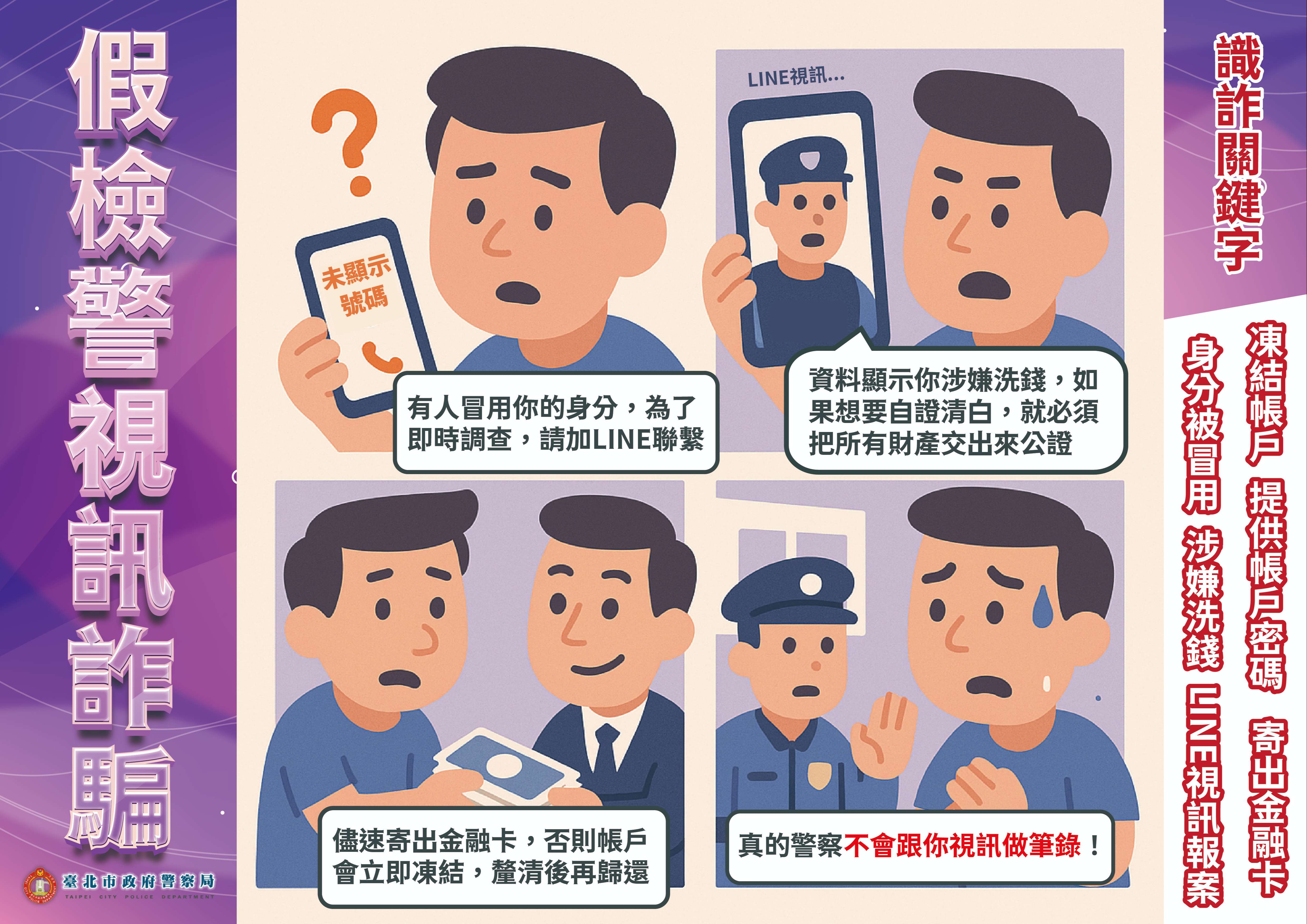 三、近期發現詐騙集團常用「假檢警視訊」、「二次詐騙」等 方式,誘導民眾匯款或轉帳,另行政院現正推動「全民普 發現金」政策,為避免詐騙集團藉以行騙,爰彙整宣導圖 文素材4張(含114年9月打詐儀錶板數據、4格漫畫案例、 宣導傳單)、影片1部及製作跑馬燈文字稿(如附件),作為10月宣導主軸,並上傳Google雲端連結供下載,以利提 升識詐宣導廣度。