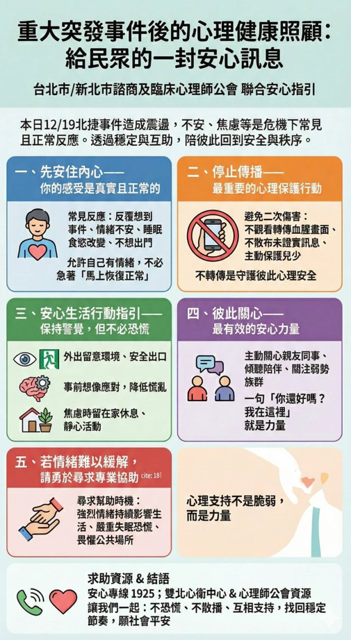 本日(12/19)台北車站、捷運中山站附近突發暴力事件造成社會震盪,許多人出現不安、焦慮、驚恐、憤怒、悲傷、失眠或身心不適,這些都是人在危機下常見且正常的反應。讓我們透過具體而溫和的行動、穩定與互助,陪彼此回到安全與秩序。