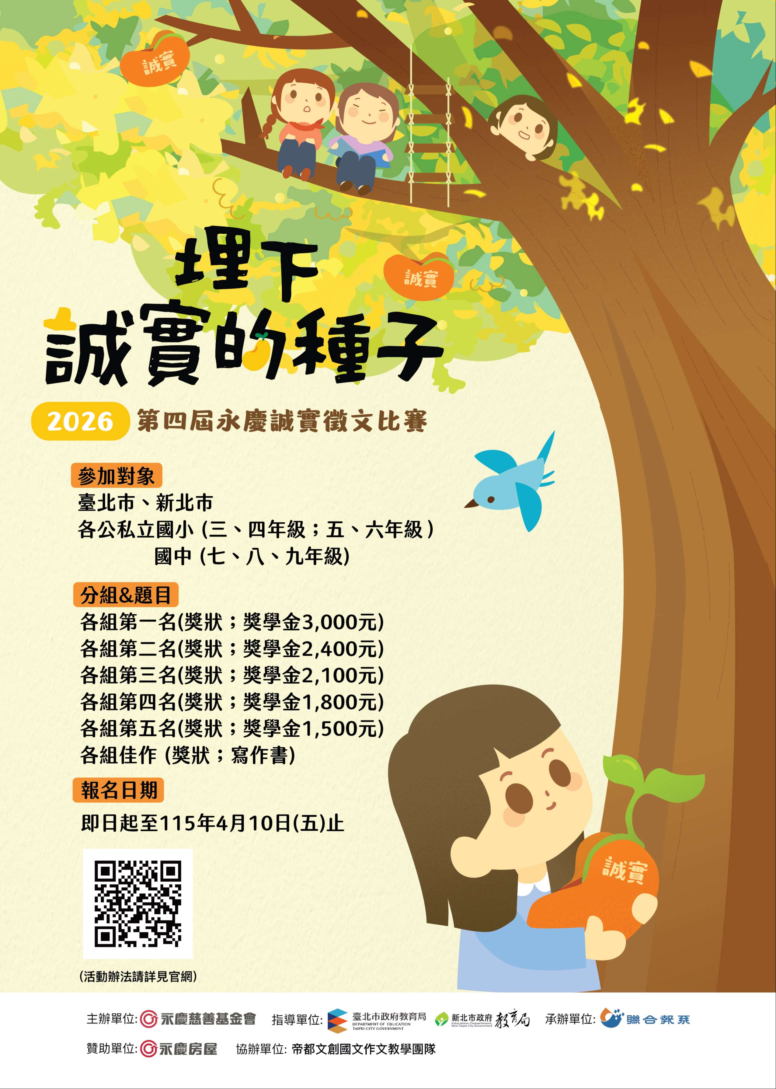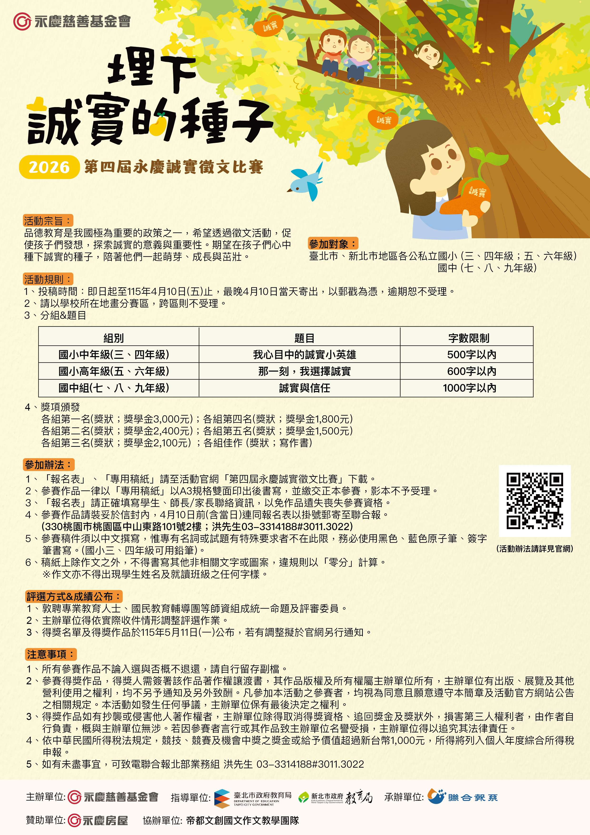 二、旨案乃為透過徵文活動,培養學生對於生活的觀察力,並從寫作中探索自我價值與思潮,讓品格教育的觀念向下扎 根,以「埋下誠實的種子」為主題,希望學生從將品格素養融入文字的過程中,亦將優良德行落實於日常生活、徵文活動內容摘要如下:
