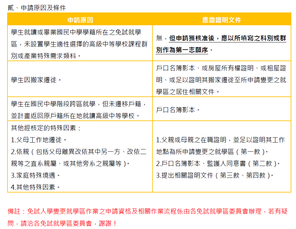 欲申請變更就學區者,請於115年04月23日(星期四)上午9時起至115年04月30日(星期四)下午5時止,登入免試入學變更就學區系統進行線上申請作業,填寫相關資料。