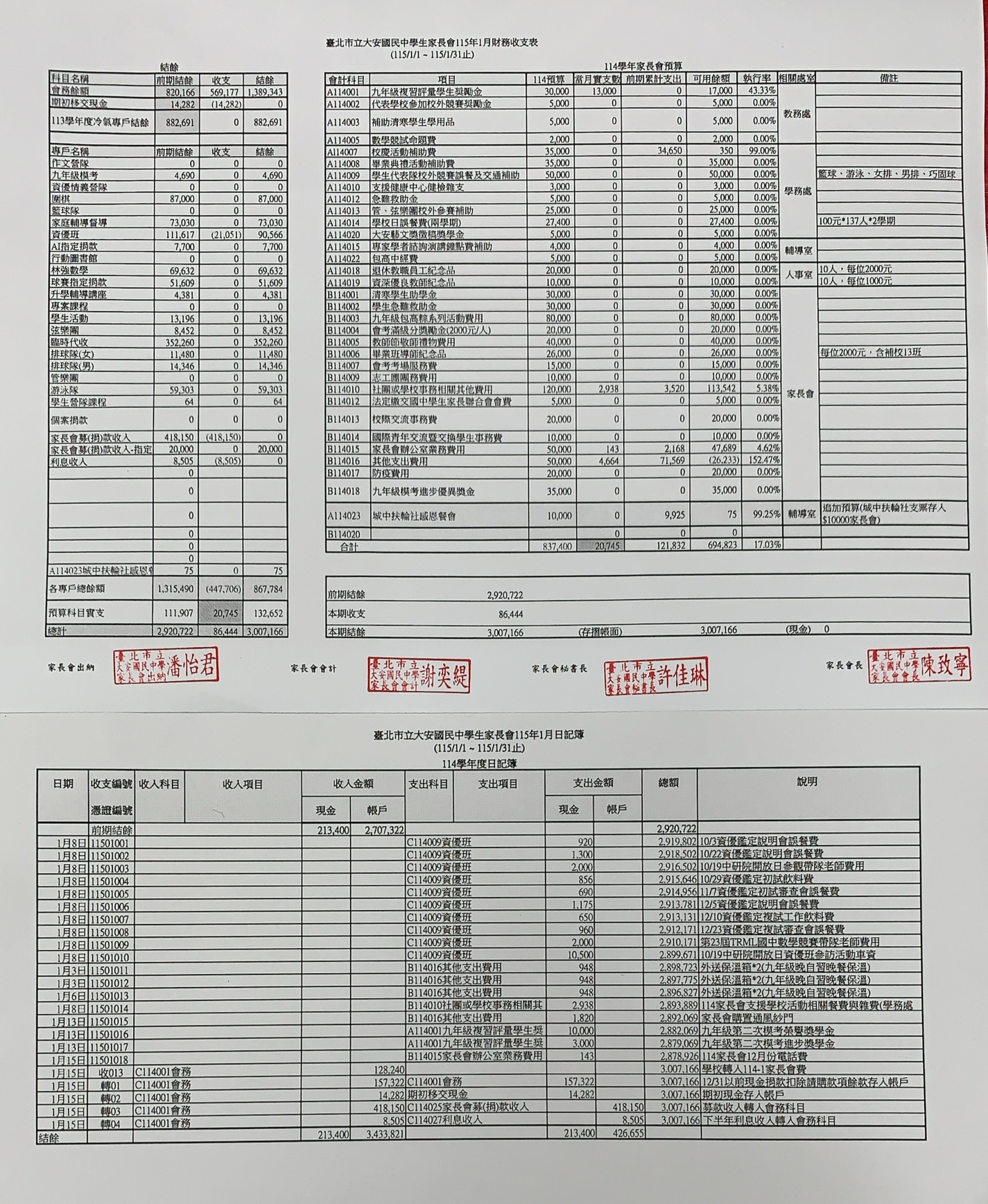 臺北市立大安國民中學家長會115年度1月財務收支表