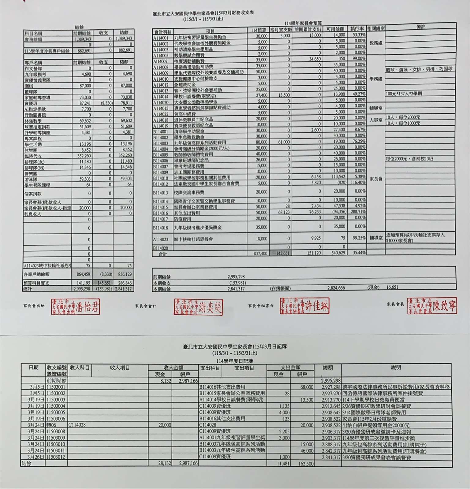 臺北市立大安國民中學家長會115年度3月財務收支表