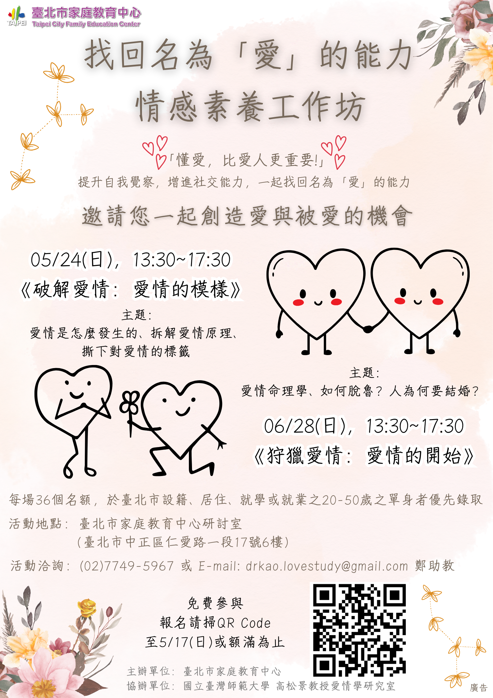 二、「臺北市家庭教育中心115年度『找回名為「愛」的能力—情感素養工作坊』,於5月24日及6月28日(星期日)13時30分至17時30分假臺北市家庭教育中心舉辦,活動名額為36人,歡迎年齡20歲以上至50歲之單身者踴躍報名參加(於本市設籍、居住、就學或就業者為